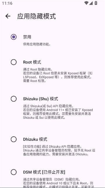 3、多渠道免Root运用隐藏:适用 Shizuku、DSM 等方式隐藏运用。